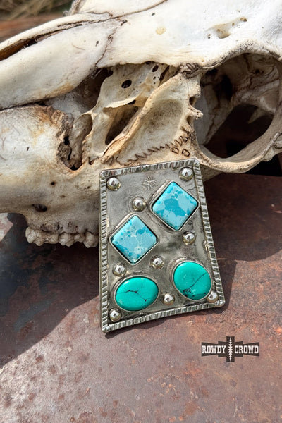 Bold and built to stand out—the Cattleman Scarf Slide features two sky-blue square and two rich teal oval turquoise beads. With stamped details and domed silver accents, it’s the perfect pop of Southwestern flair for any Western look.